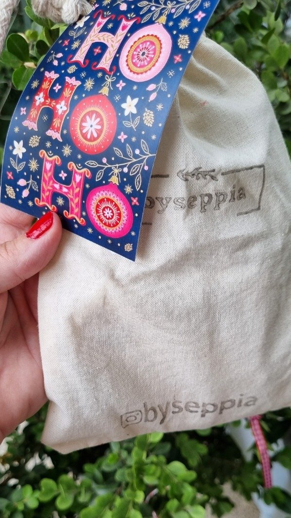 Todo esto, dentro de una bolsita de tela byseppia y su tarjetita HO HO HO!