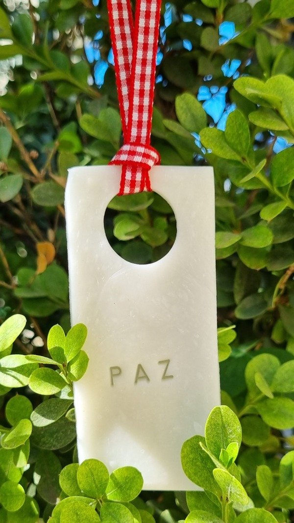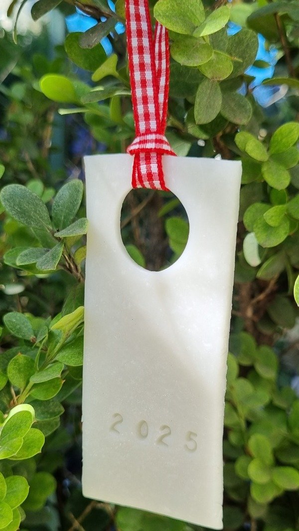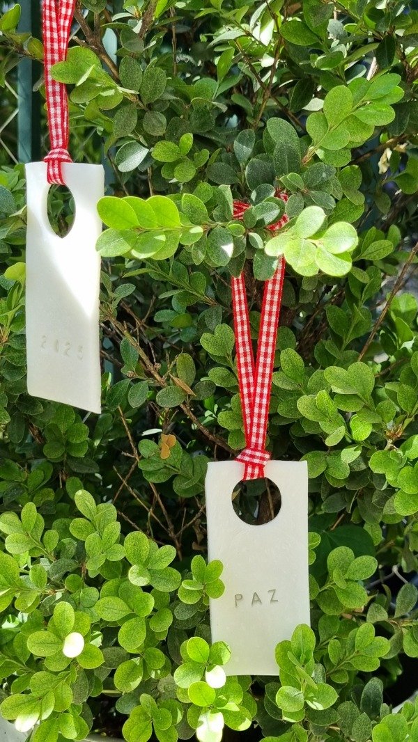 Paz, alegria y 2025. Vienen con una cinta bebe en cuadrille roja y blanca para colgar del arbol o pasarla por la servilleta.