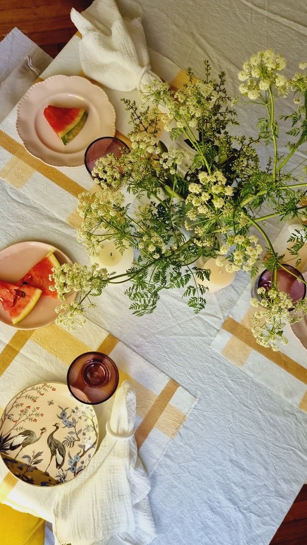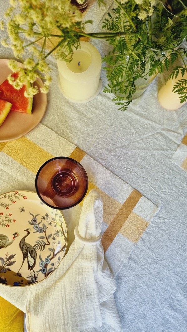 Tusor liviano blanco con cuadricula pintada a mano en dos tonos de marrones.