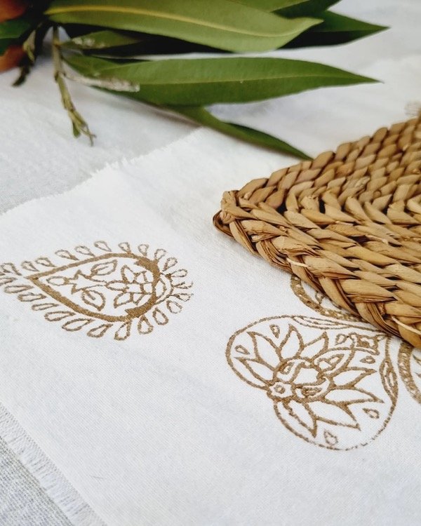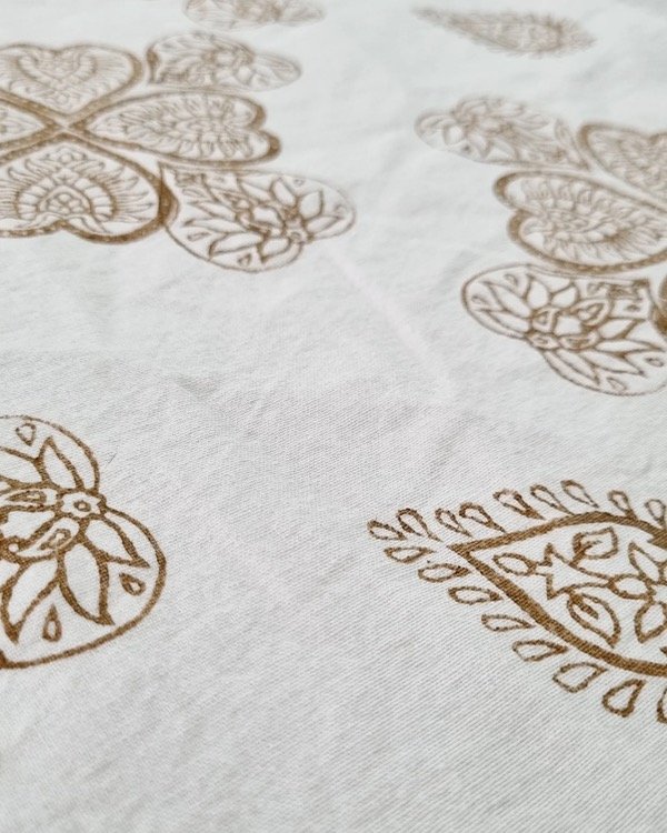 Tusor blanco con estampa en sello de madera indu, en color marrón.