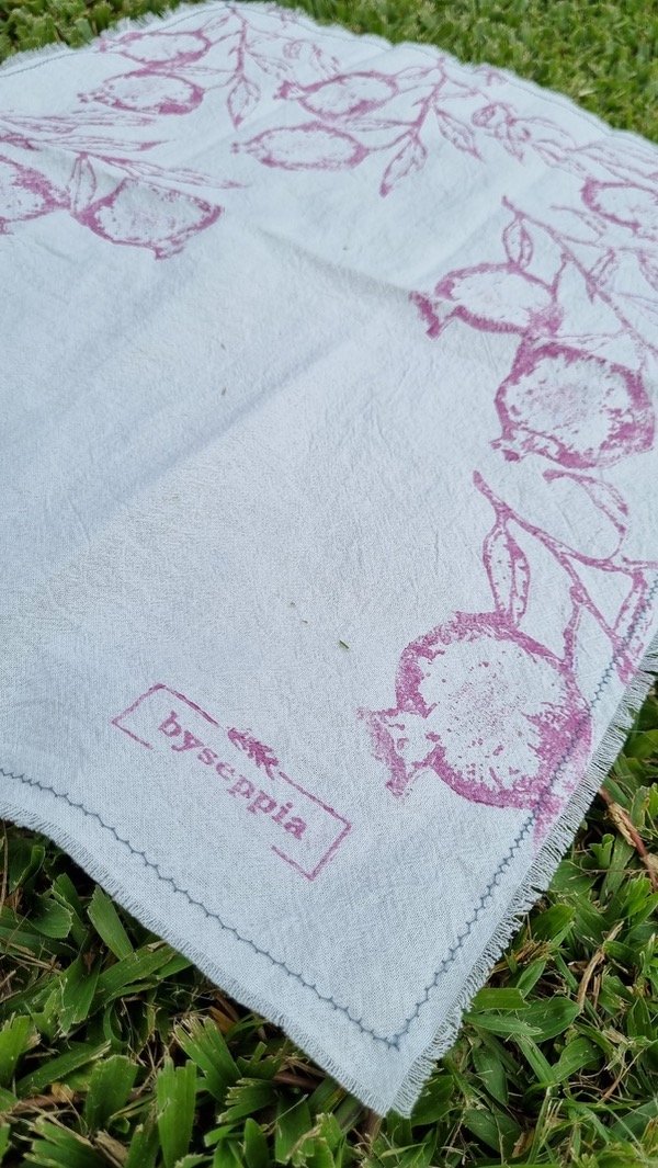 Tusor liviano blanco con estampa de ramo de granada en color magenta.