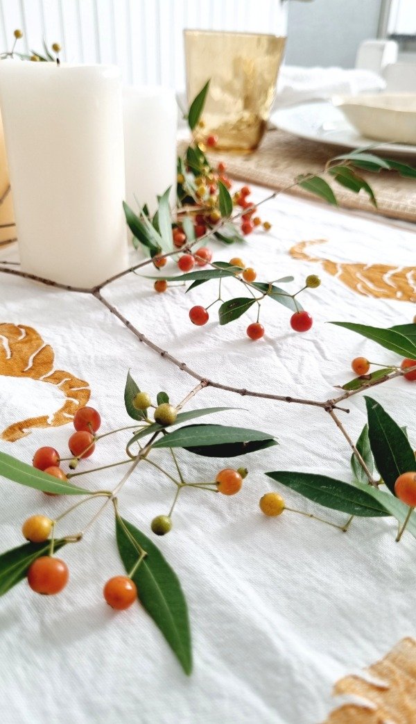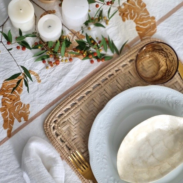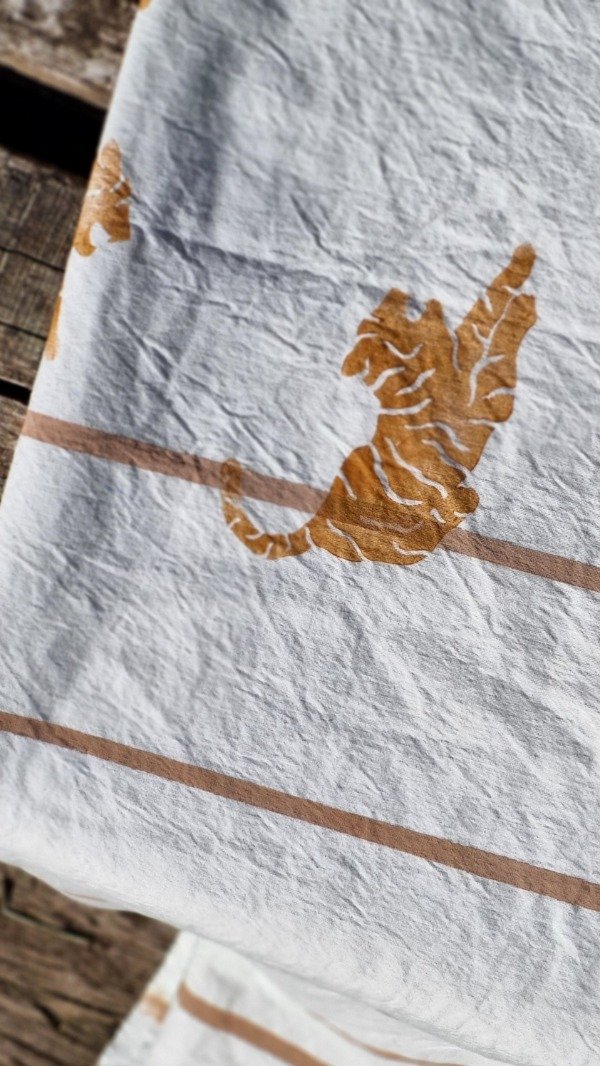 Tusor pesado off white con estampa central de chitas en tono marron anaranjado y en ambos laterales rayas finas en tono beige.