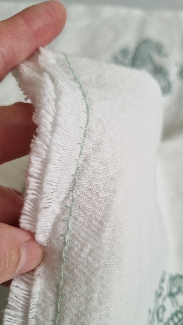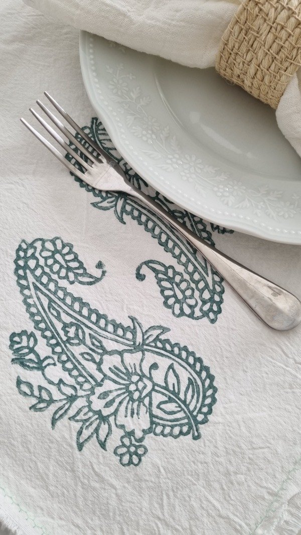 Mantel de Tusor pesado off white con estampado en color Aqua.