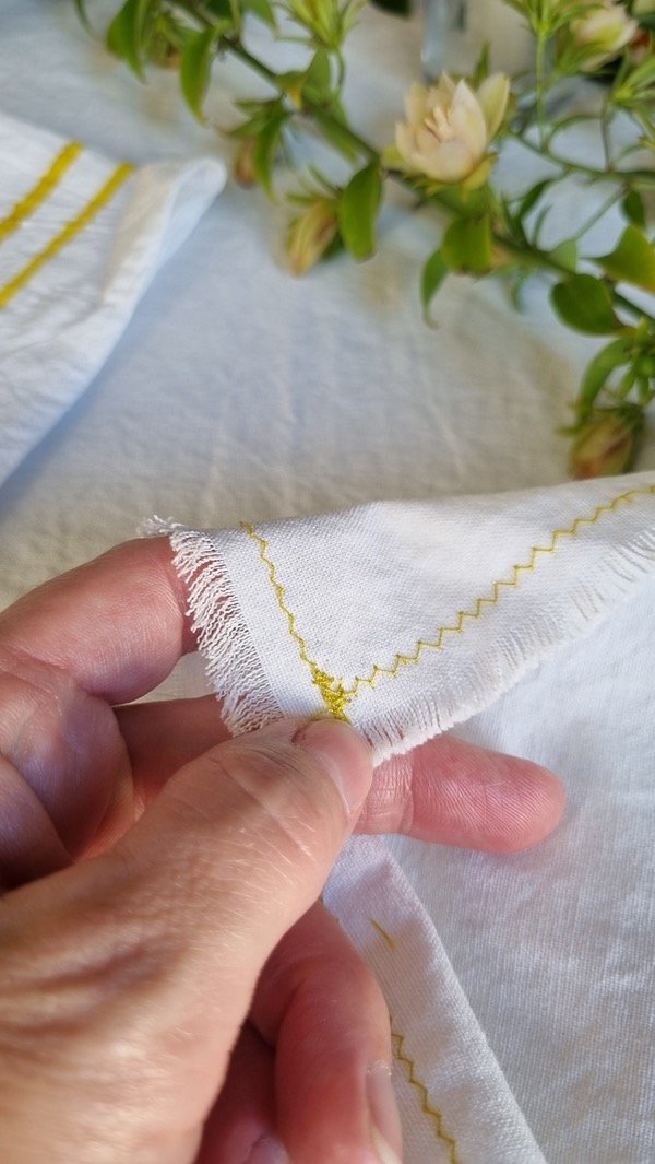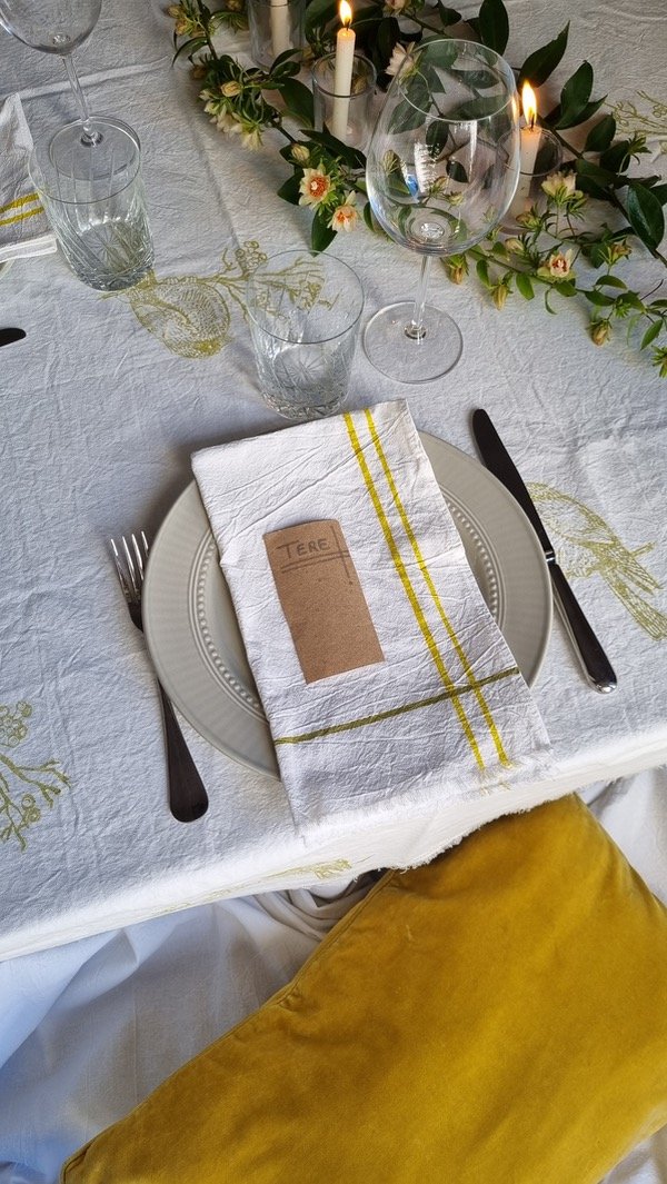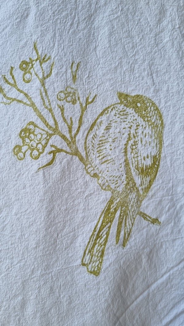 Tusor blanco off white con estampa de pájaro apoyado en la rama en color verde seco en todo el mantel.