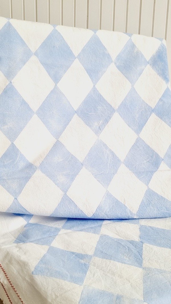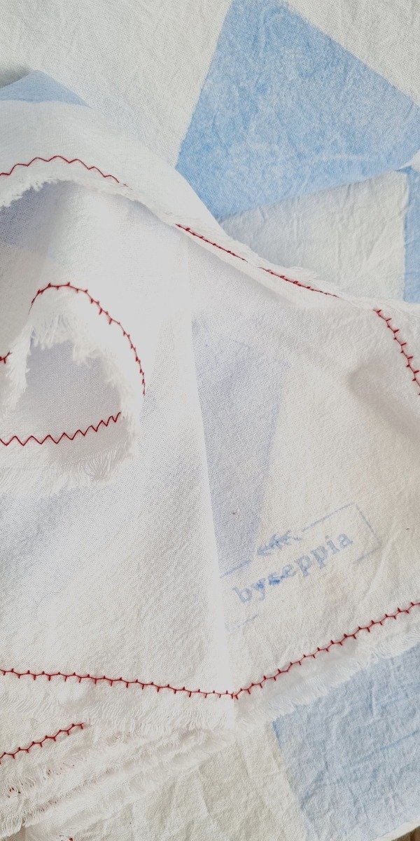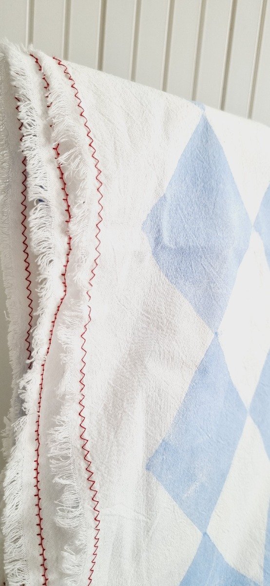 Tusor blanco off white pesado, estampado artesanal con figuras de rombos celeste siguiendo la tecnica de rapport. Terminacion desflecada y hilo rojo en zig- zag .