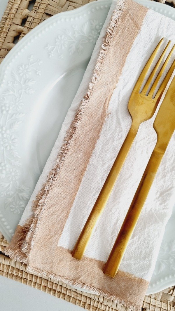 Servilleta en Tusor pesado blanco off white con borde en color nude. Desflecada y zig zag al tono.