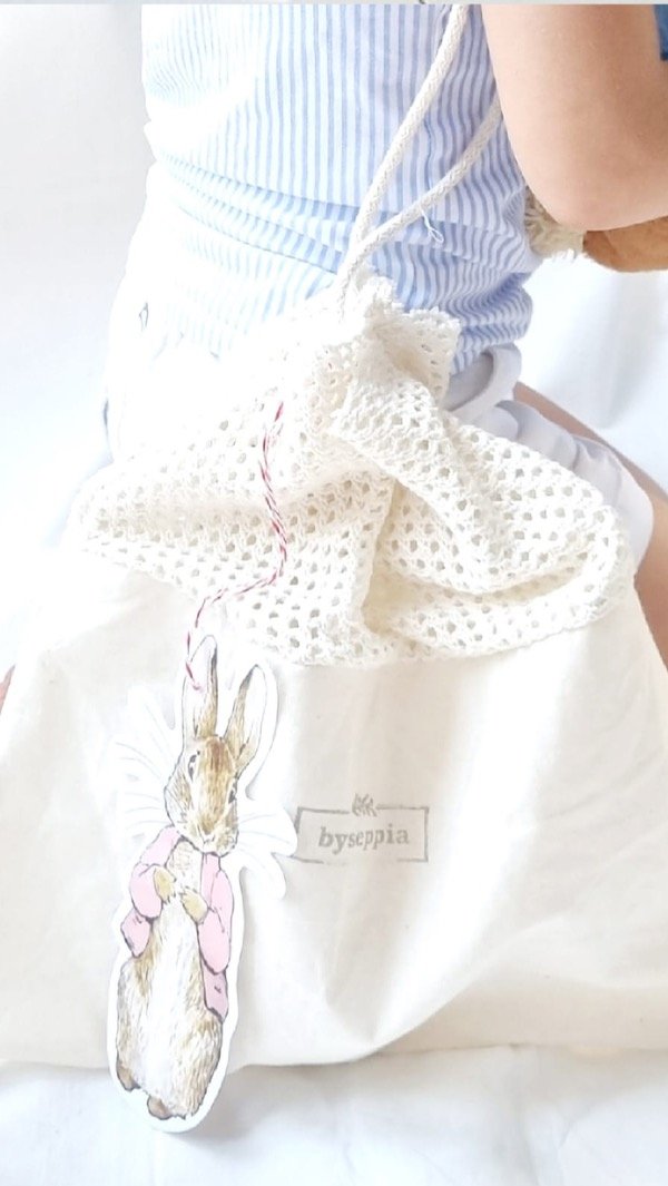 Kit de 4 servilletas en gasa de algodón con superposición de tela estampado artesanalmente de Peter Rabbit en color gris + camino en gasa de algodón cruda.
